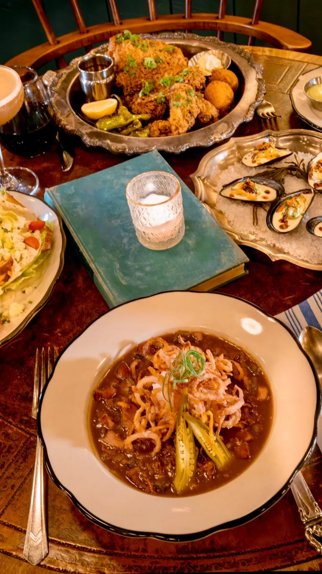 The dining menu is concise, and everything on it is what you want. It leans on oysters and fruits de mer, caviar, an exceptional smash burger, lobster frites, our mom’s famous pralines, and gumbo till it runs dry.